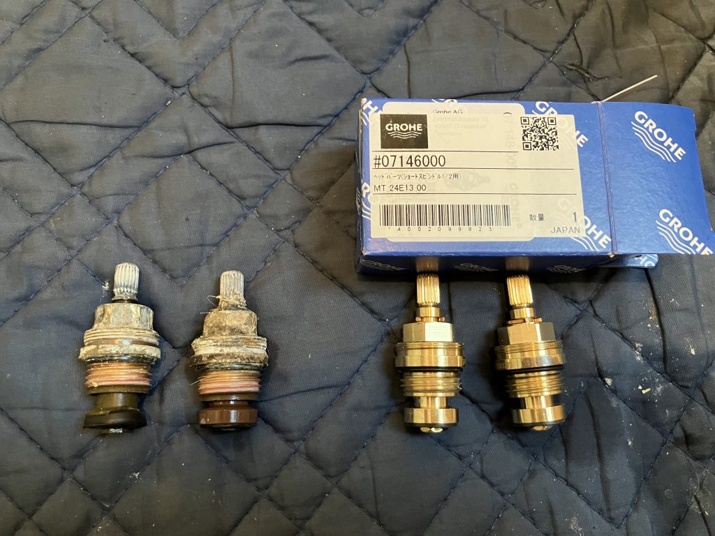 かなりの年数が経っている水栓だったので、本来であれば本体の交換でご提案したいところでしたが、こちらのお客様は浴室全体のリフォームも検討中との事で、なるべく最低限の修理で済ませたいとのご要望があったため、今回は部品修理にて完了いたしました。