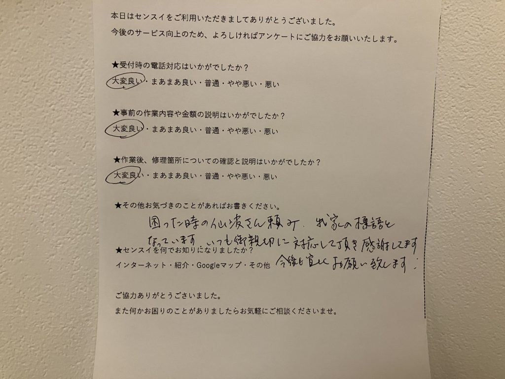 後日部品が入荷したので再度お伺いし、部品の交換にて症状は改善いたしました。